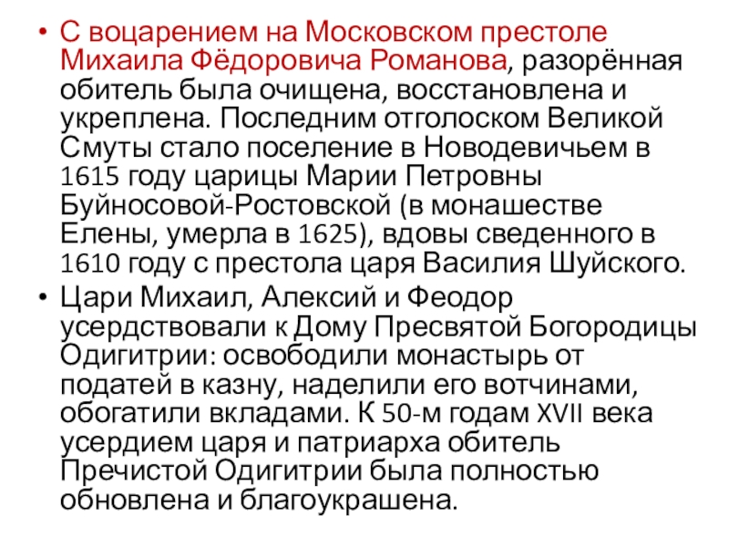 Слайд 18С воцарением на Московском престоле Михаила Фёдоровича Романова, разорённая обитель была