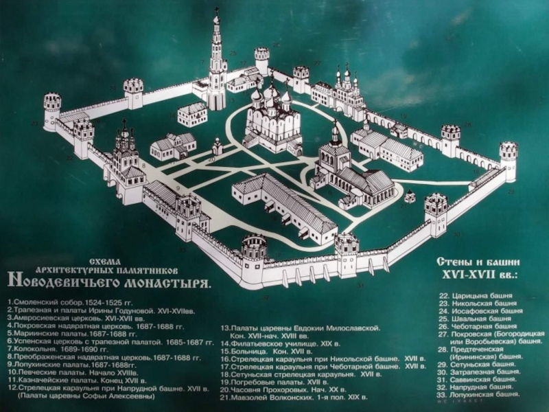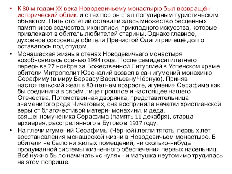 Слайд 32К 80-м годам XX века Новодевичьему монастырю был возвращён исторический облик,