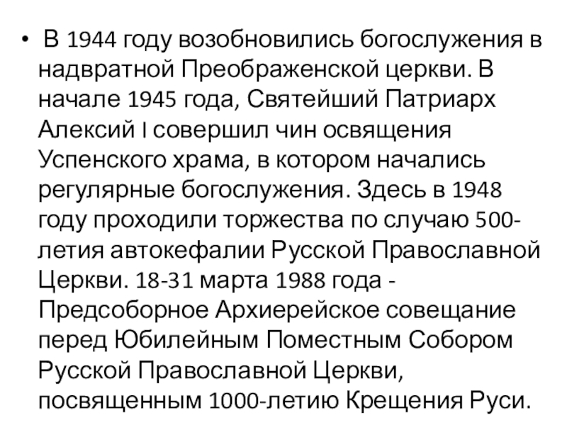 Слайд 30 В 1944 году возобновились богослужения в надвратной Преображенской церкви. В начале