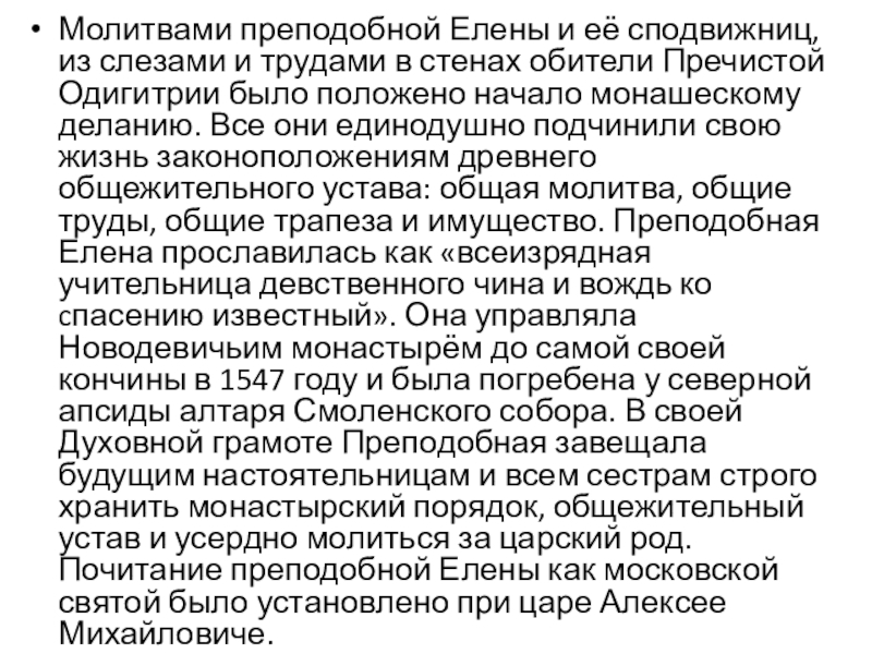 стенах обители Пречистой Одигитрии было положено начало монашескому деланию. Все они единодушно подчинили свою жизнь законоположениям древнего общежительного устава: общая молитва, общие труды, общие трапеза и имущество. Преподобная Елена прославилась как «всеизрядная учительница девственного чина и вождь ко cпасению известный». Она управляла Новодевичьим монастырём до самой своей кончины в 1547 году и была погребена у северной апсиды алтаря Смоленского собора. В своей Духовной грамоте Преподобная завещала будущим настоятельницам и всем сестрам строго хранить монастырский порядок, общежительный устав и усердно молиться за царский род. Почитание преподобной Елены как московской святой было установлено при царе Алексее Михайловиче.