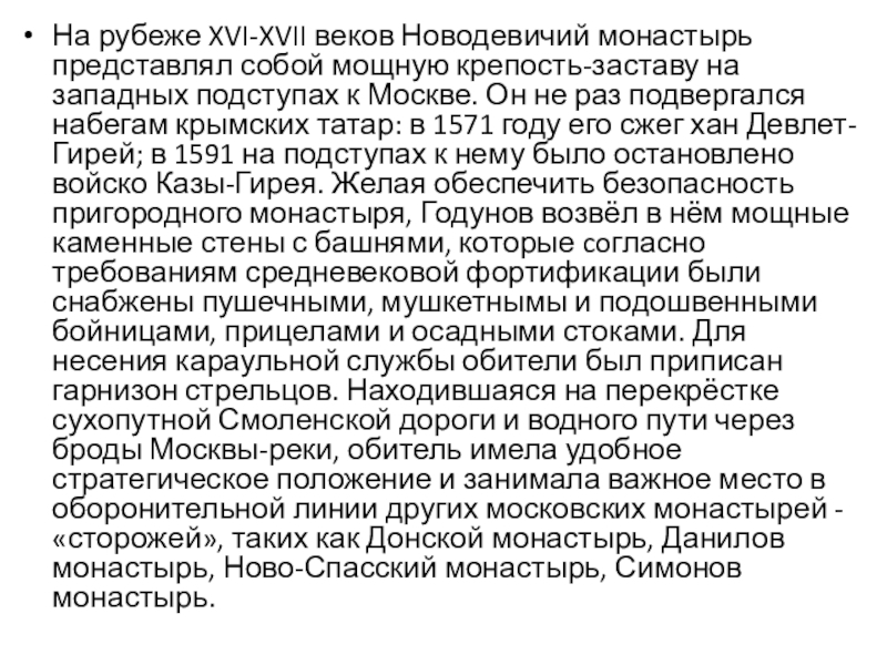 западных подступах к Москве. Он не раз подвергался набегам крымских татар: в 1571 году его сжег хан Девлет-Гирей; в 1591 на подступах к нему было остановлено войско Казы-Гирея. Желая обеспечить безопасность пригородного монастыря, Годунов возвёл в нём мощные каменные стены с башнями, которые coгласно требованиям средневековой фортификации были снабжены пушечными, мушкетнымы и подошвенными бойницами, прицелами и осадными стоками. Для несения караульной службы обители был приписан гарнизон стрельцов. Находившаяся на перекрёстке сухопутной Смоленской дороги и водного пути через броды Москвы-реки, обитель имела удобное стратегическое положение и занимала важное место в оборонительной линии других московских монастырей - «сторожей», таких как Донской монастырь, Данилов монастырь, Ново-Спасский монастырь, Симонов монастырь.