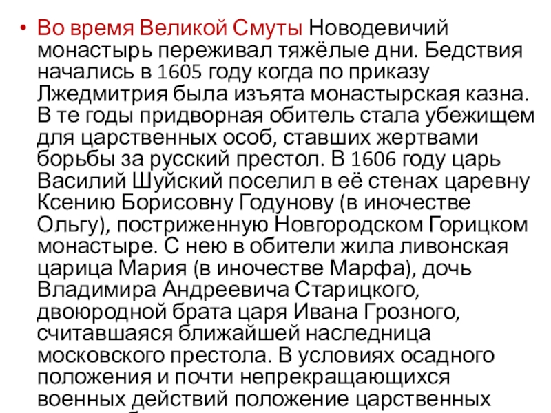 Слайд 17Во время Великой Смуты Новодевичий монастырь переживал тяжёлые дни. Бедствия начались