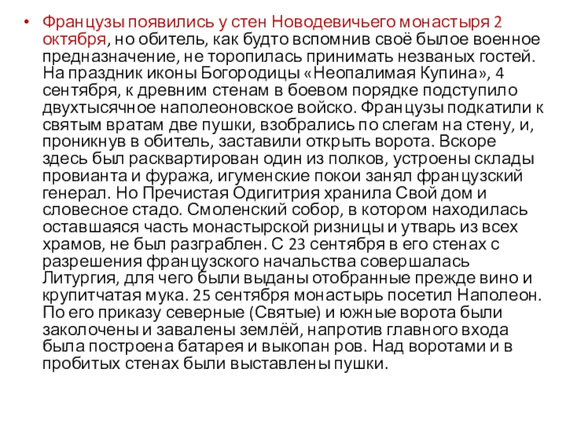 Слайд 26Французы появились у стен Новодевичьего монастыря 2 октября, но обитель, как