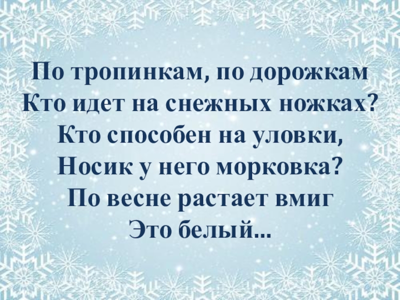 По тропинкам, по дорожкам Кто идет на снежных ножках? Кто способен на уловки, Носик у него морковка?