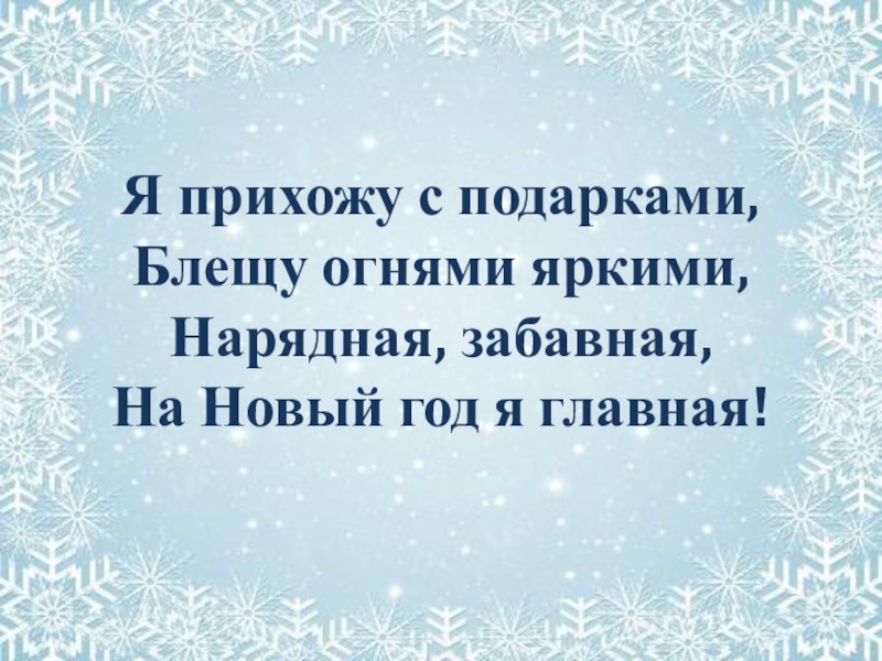 Я прихожу с подарками, Блещу огнями яркими, Нарядная, забавная, На Новый год я главная!