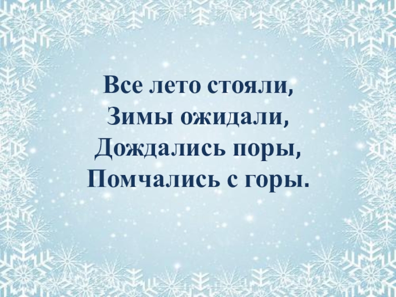 Слайд 6Все лето стояли, Зимы ожидали, Дождались поры, Помчались с горы.