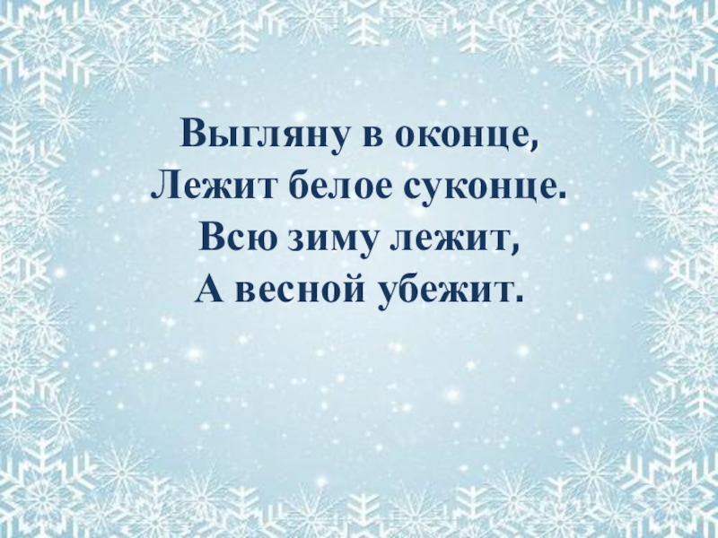 Слайд 10Выгляну в оконце, Лежит белое суконце. Всю зиму лежит, А весной убежит.