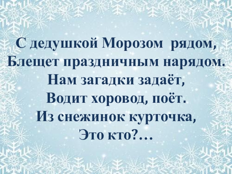 Слайд 18 С дедушкой Морозом  рядом, Блещет праздничным нарядом. Нам загадки задаёт,  Водит хоровод, поёт. Из снежинок