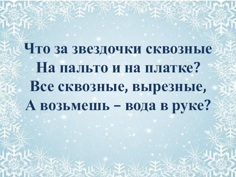 Что за звездочки сквозные На пальто и на платке? Все сквозные, вырезные, А возьмешь – вода в