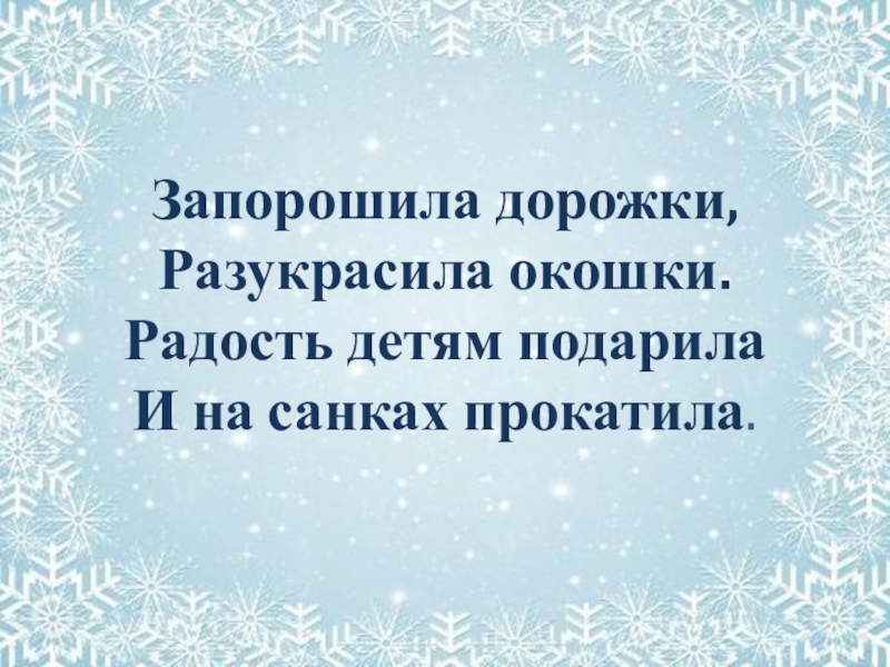 Слайд 2Запорошила дорожки, Разукрасила окошки. Радость детям подарила И на санках прокатила.