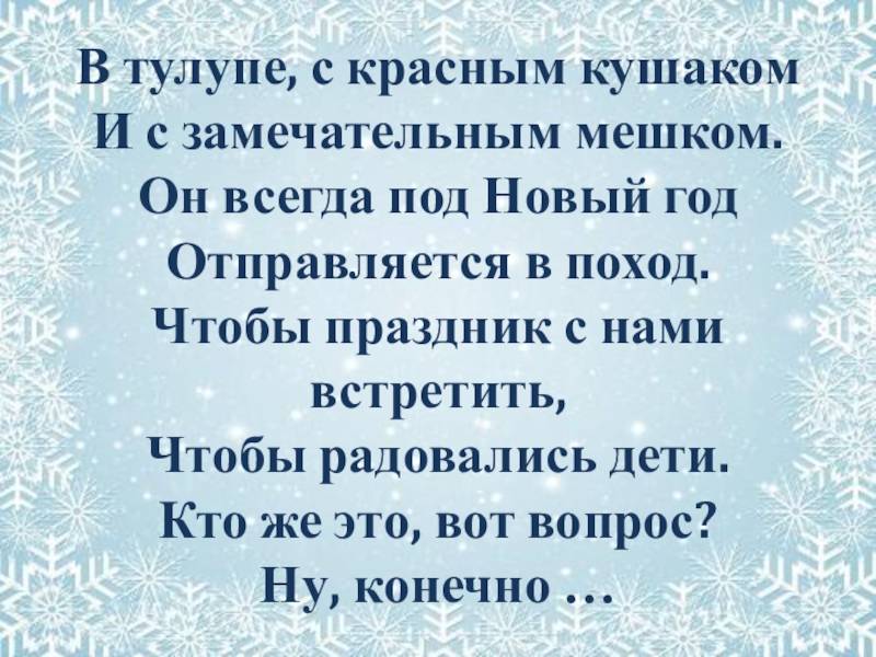 под Новый год Отправляется в поход. Чтобы праздник с нами встретить, Чтобы радовались дети. Кто же это, вот вопрос? Ну, конечно …