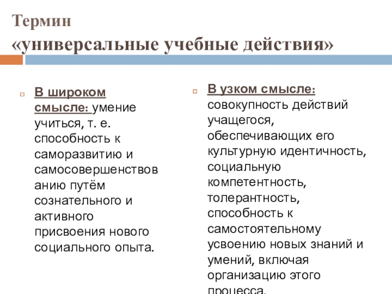 В узком смысле: совокупность действий учащегося, обеспечивающих его культурную идентичность, социальную компетентность, толерантность, способность к самостоятельному усвоению новых знаний и умений, включая организацию этого процесса.