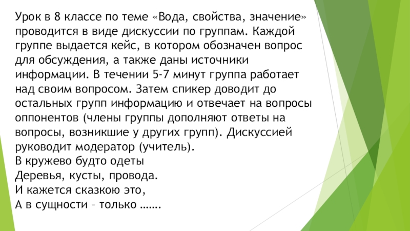 Слайд 39Урок в 8 классе по теме «Вода, свойства, значение» проводится в
