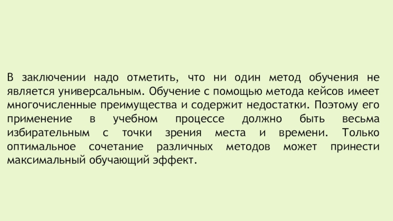 универсальным. Обучение с помощью метода кейсов имеет многочисленные преимущества и содержит недостатки. Поэтому его применение в учебном процессе должно быть весьма избирательным с точки зрения места и времени. Только оптимальное сочетание различных методов может принести максимальный обучающий эффект.