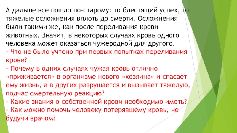 вплоть до смерти. Осложнения были такими же, как после переливания крови животных. Значит, в некоторых случаях кровь одного человека может оказаться чужеродной для другого.