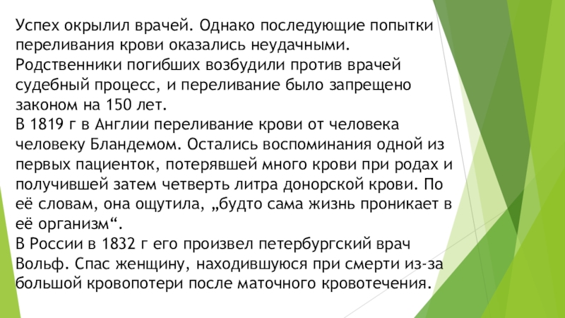 Слайд 30Успех окрылил врачей. Однако последующие попытки переливания крови оказались неудачными. Родственники