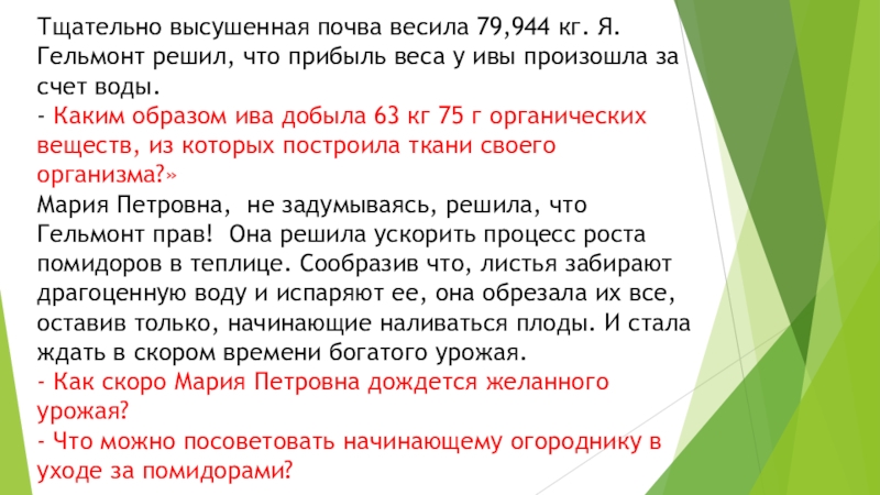 Мария Петровна, не задумываясь, решила, что Гельмонт прав! Она решила ускорить процесс роста помидоров в теплице. Сообразив что, листья забирают драгоценную воду и испаряют ее, она обрезала их все, оставив только, начинающие наливаться плоды. И стала ждать в скором времени богатого урожая.