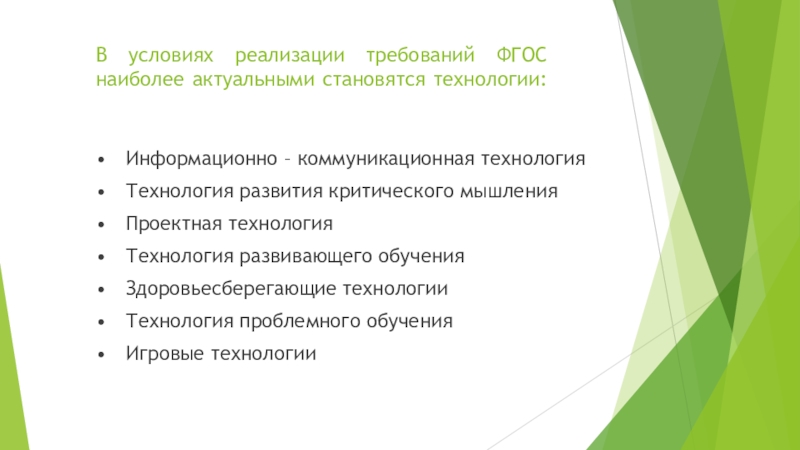 Слайд 3В условиях реализации требований ФГОС наиболее актуальными становятся технологии: