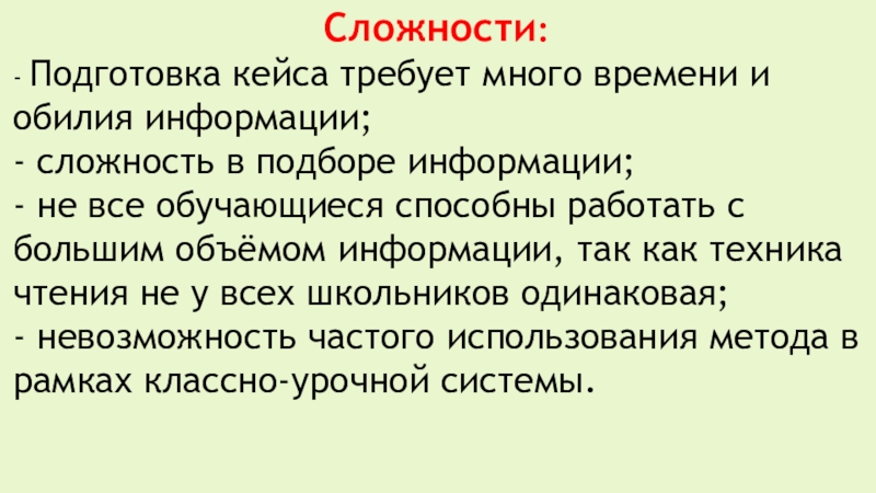 - Подготовка кейса требует много времени и обилия информации;