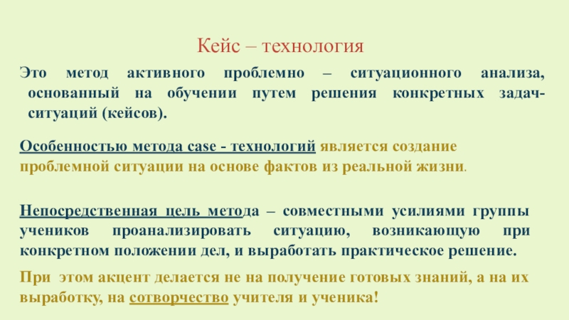 Особенностью метода case - технологий является создание проблемной ситуации на основе фактов из реальной жизни.