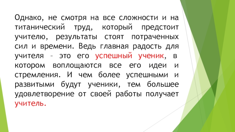 предстоит учителю, результаты стоят потраченных сил и времени. Ведь главная радость для учителя – это его успешный ученик, в котором воплощаются все его идеи и стремления. И чем более успешными и развитыми будут ученики, тем большее удовлетворение от своей работы получает учитель.