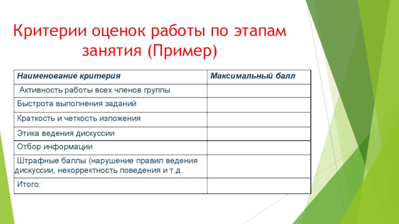 Слайд 17Критерии оценок работы по этапам занятия (Пример)