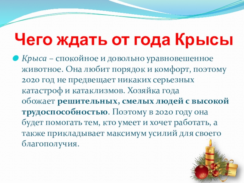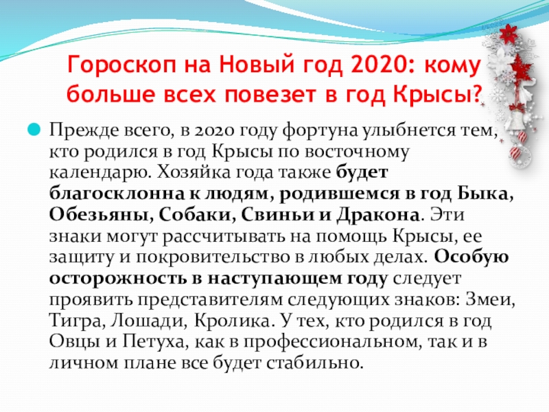 Прежде всего, в 2020 году фортуна улыбнется тем, кто родился в год Крысы по восточному календарю. Хозяйка года также будет благосклонна к людям, родившемся в год Быка, Обезьяны, Собаки, Свиньи и Дракона. Эти знаки могут рассчитывать на помощь Крысы, ее защиту и покровительство в любых делах. Особую осторожность в наступающем году следует проявить представителям следующих знаков: Змеи, Тигра, Лошади, Кролика. У тех, кто родился в год Овцы и Петуха, как в профессиональном, так и в личном плане все будет стабильно.