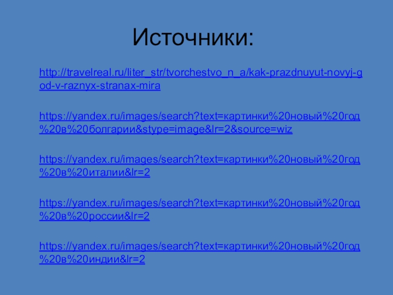Источники:http://travelreal.ru/liter_str/tvorchestvo_n_a/kak-prazdnuyut-novyj-god-v-raznyx-stranax-mira https://yandex.ru/images/search?text=картинки%20новый%20год%20в%20болгарии&stype=image&lr=2&source=wiz https://yandex.ru/images/search?text=картинки%20новый%20год%20в%20италии&lr=2 https://yandex.ru/images/search?text=картинки%20новый%20год%20в%20россии&lr=2https://yandex.ru/images/search?text=картинки%20новый%20год%20в%20индии&lr=2