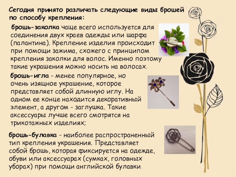брошь-булавка - наиболее распространенный тип крепления украшения. Представляет собой брошь, которая фиксируется на одежде, обуви или аксессуарах (сумках, головных уборах) при помощи английской булавки.