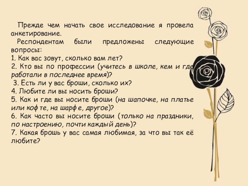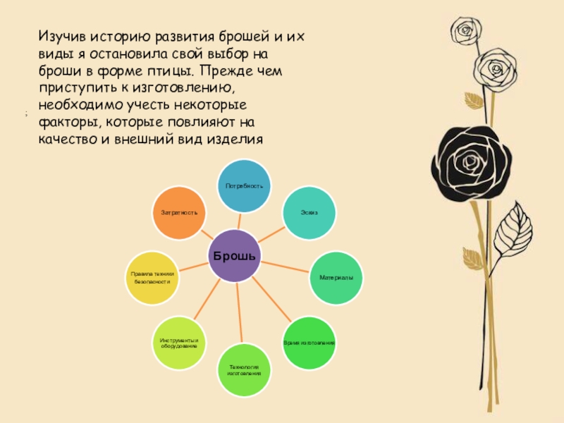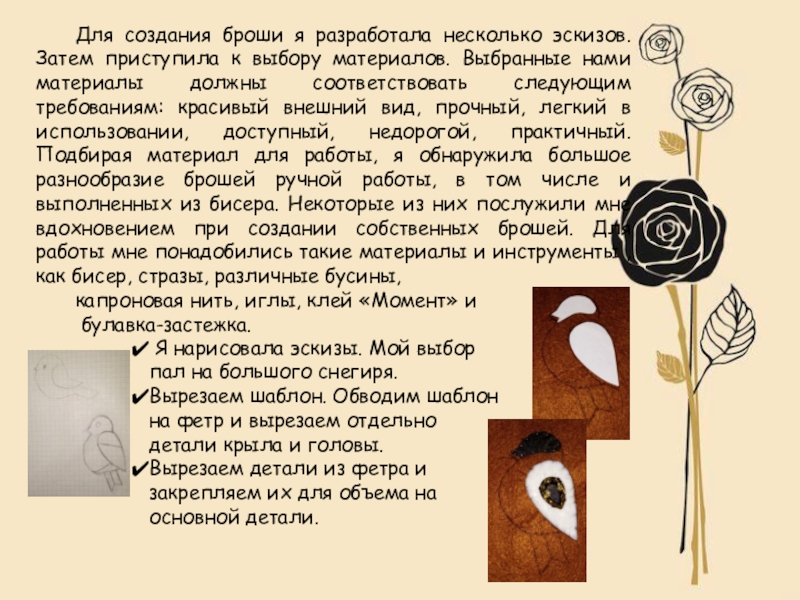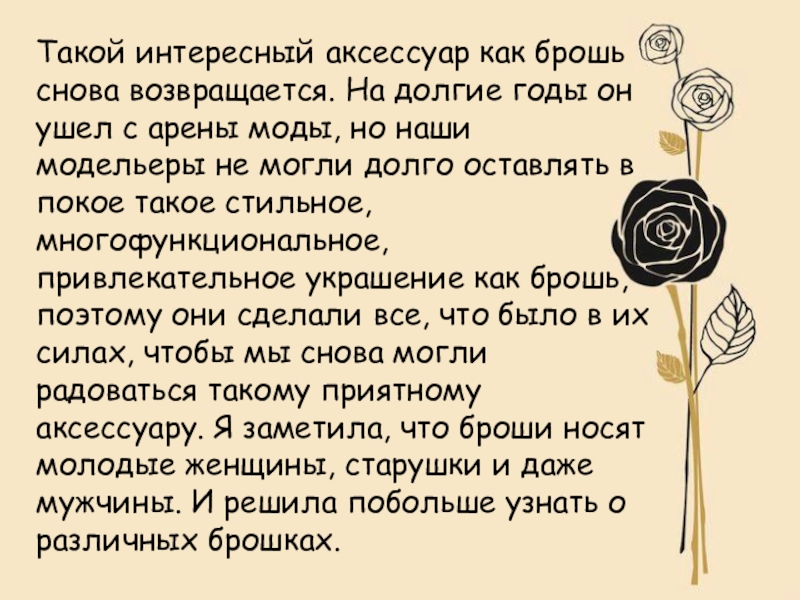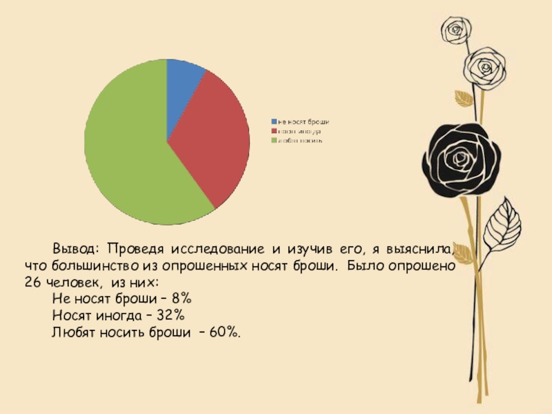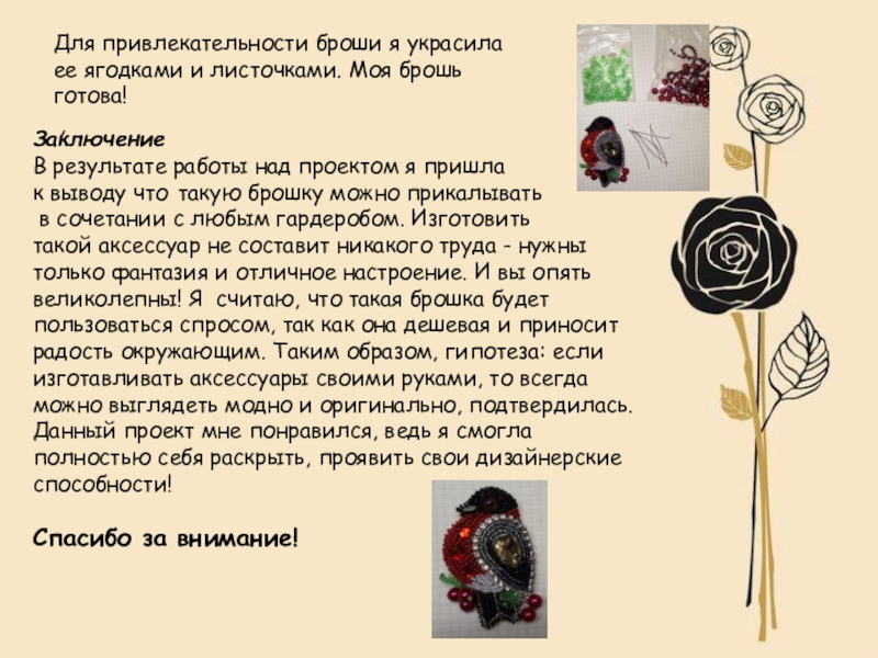 такой аксессуар не составит никакого труда - нужны только фантазия и отличное настроение. И вы опять великолепны! Я считаю, что такая брошка будет пользоваться спросом, так как она дешевая и приносит радость окружающим. Таким образом, гипотеза: если изготавливать аксессуары своими руками, то всегда можно выглядеть модно и оригинально, подтвердилась. Данный проект мне понравился, ведь я смогла полностью себя раскрыть, проявить свои дизайнерские способности!