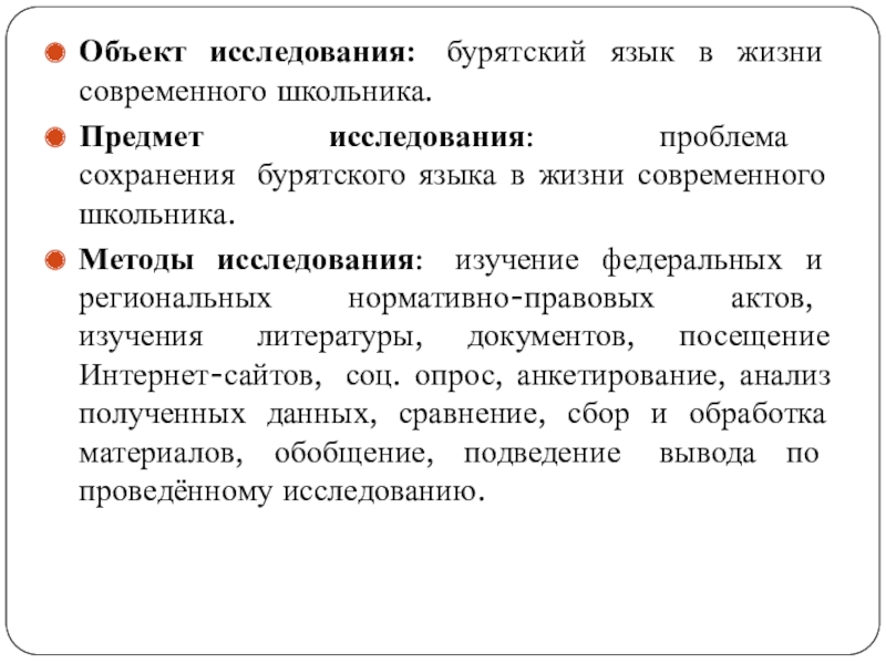 Слайд 4Объект исследования: бурятский язык в жизни современного школьника.