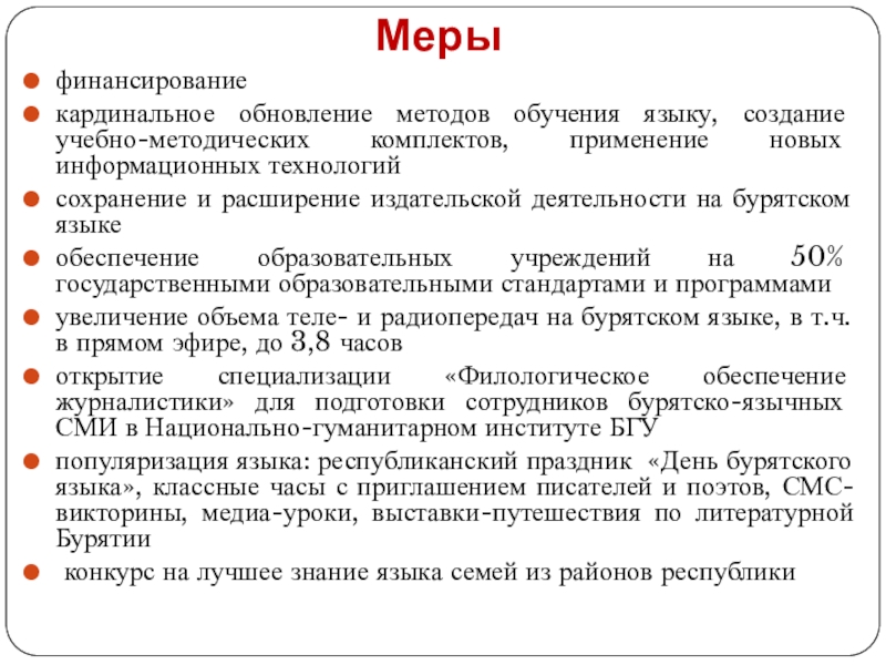 увеличение объема теле- и радиопередач на бурятском языке, в т.ч. в прямом эфире, до 3,8 часов