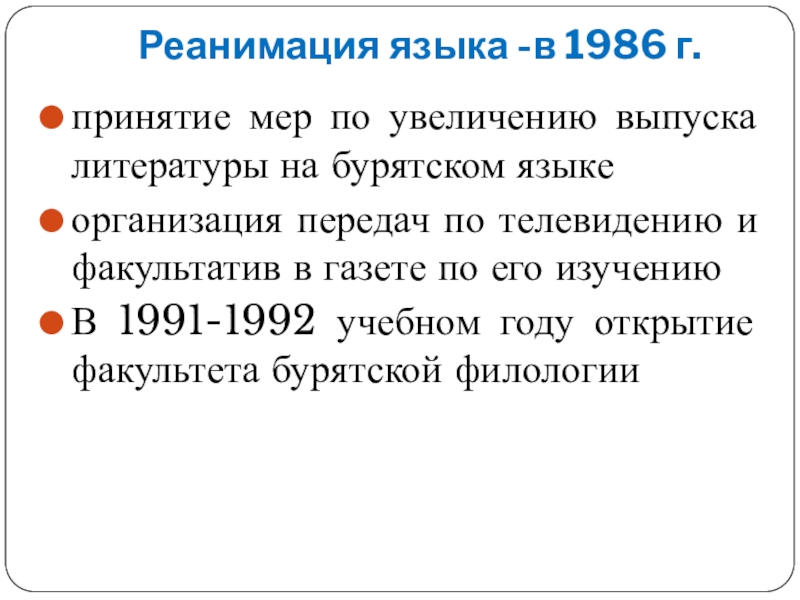 Сокращение числа бурятских школ, издания литературы, передач по радио и телевидению на бурятском языке.