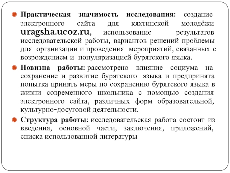 Слайд 5Практическая значимость исследования: создание электронного сайта для кяхтинской молодёжи uragsha.ucoz.ru, использование