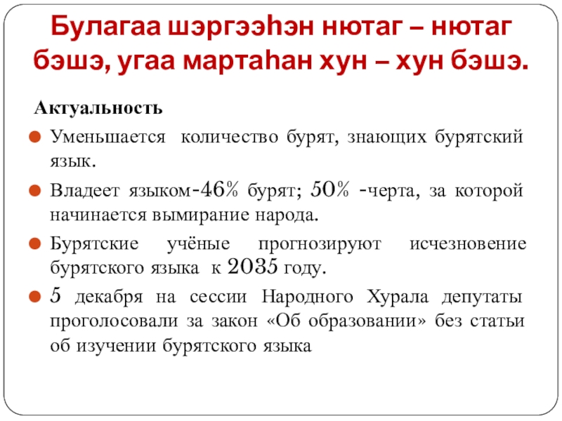 Владеет языком-46% бурят; 50% -черта, за которой начинается вымирание народа.
