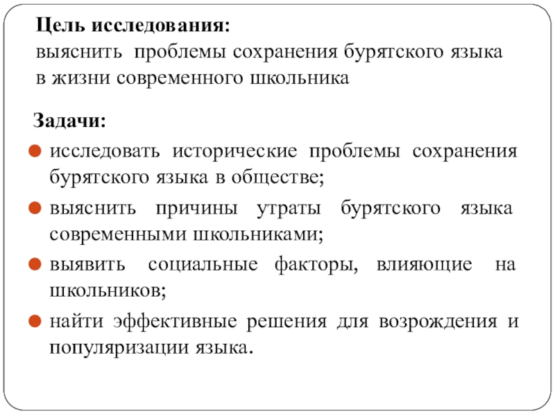 выяснить причины утраты бурятского языка современными школьниками;