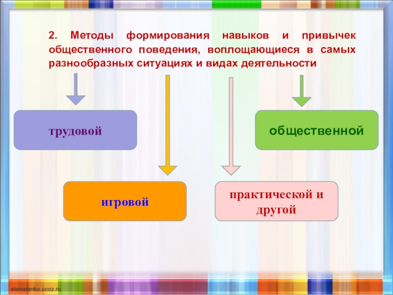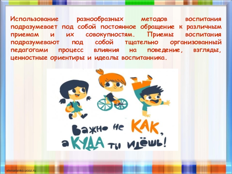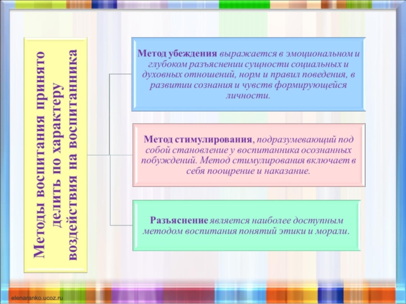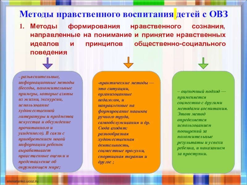– разъяснительные, информационные методы (беседы, положительные примеры, которые взяты из жизни, экскурсии, использование художественной литературы и предметов искусства и обсуждение прочитанного и увиденного). В связи с приобретением новой информации ребенок вырабатывает нравственные оценки и представление об окружающем мире;