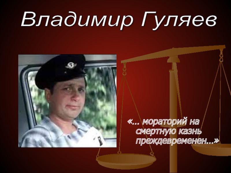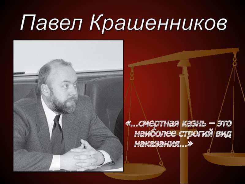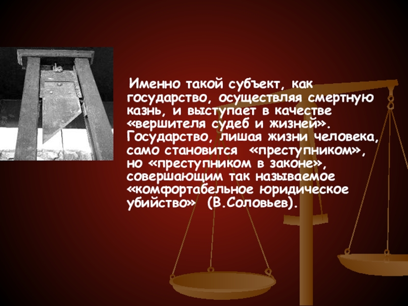выступает в качестве «вершителя судеб и жизней». Государство, лишая жизни человека, само становится «преступником», но «преступником в законе», совершающим так называемое «комфортабельное юридическое убийство» (В.Соловьев).