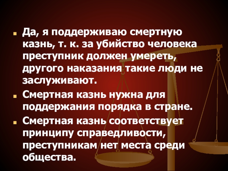 Смертная казнь соответствует принципу справедливости, преступникам нет места среди общества.