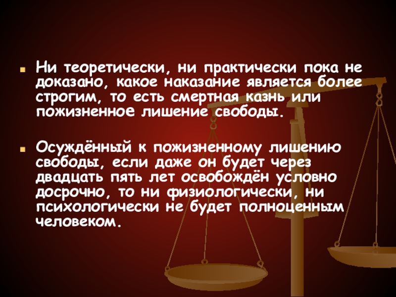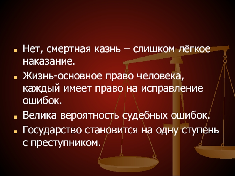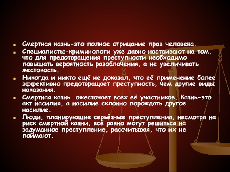 непоправимых судебных ошибок. Пока существует хотя бы малейшая возможность ошибки, отдавать преступника в руки палача нельзя. Что же касается утверждения, что страх быть казненным может сдержать потенциального преступника, то оно весьма спорно.