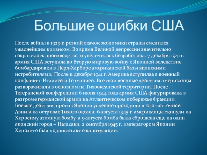кризисом. Во время Великой депрессии значительно сократилось производство, и увеличилась безработица. 7 декабря 1941 г. армия США вступила во Вторую мировую войну с Японией вследствие бомбардировки в Перл-Харборе американской базы японскими истребителями. После 11 декабря 1941 г. Америка вступилаа в военный конфликт с Италией и Германией. Все свои военные действия американцы разворачивали в основном на Тихоокеанской территории. После Тегеранской конференции 6 июня 1944 года армия США фигурировала в разгроме германской армии на Атлантическом побережье Франции. Боевые действия против Японии успешно проходили в юго-восточной Азии и на островах Тихого океана. 6 августа 1945 г. американцы скинули на Хиросиму атомную бомбу, а 9 августа бомба была сброшена еще на один японский город – Нагасаки. 2 сентября 1945 г. императором Японии Хирохито был подписан акт о капитуляции.
