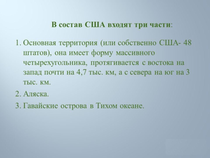 как Пуэрто-Рико, Американские Виргинские острова, Гуам и другие. Соединенные Штаты Америки расположены в центральной части Северной Америки, расположившись южнее Канады и севернее Мексики. С востока, государство омывается водами Атлантического океана, на западе водами Тихого океана, а северная часть штата Аляска - водами Северного Ледовитого океана. Площадь государства составляет 9630 тысяч квадратных километров и является 4 по площади страной мира.