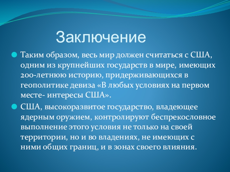 США, высокоразвитое государство, владеющее ядерным оружием, контролируют беспрекословное выполнение этого условия не только на своей территории, но и во владениях, не имеющих с ними общих границ, и в зонах своего влияния.
