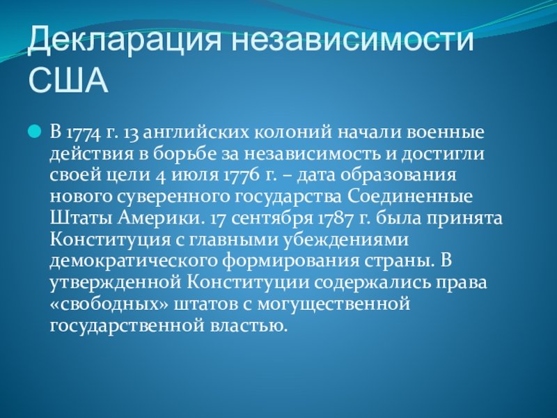 в борьбе за независимость и достигли своей цели 4 июля 1776 г. – дата образования нового суверенного государства Соединенные Штаты Америки. 17 сентября 1787 г. была принята Конституция с главными убеждениями демократического формирования страны. В утвержденной Конституции содержались права «свободных» штатов с могущественной государственной властью.