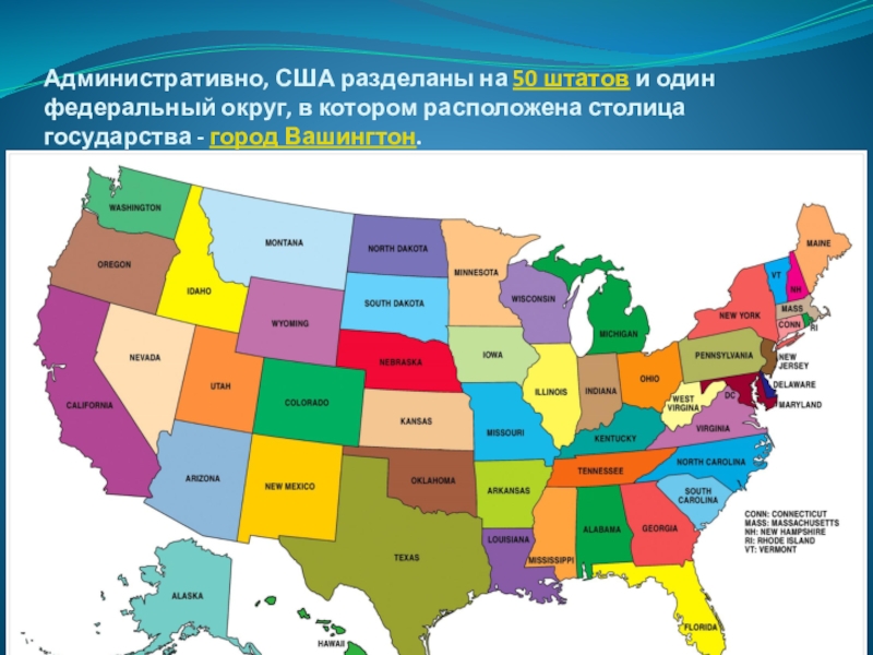 Слайд 3Административно, США разделаны на 50 штатов и один федеральный округ, в