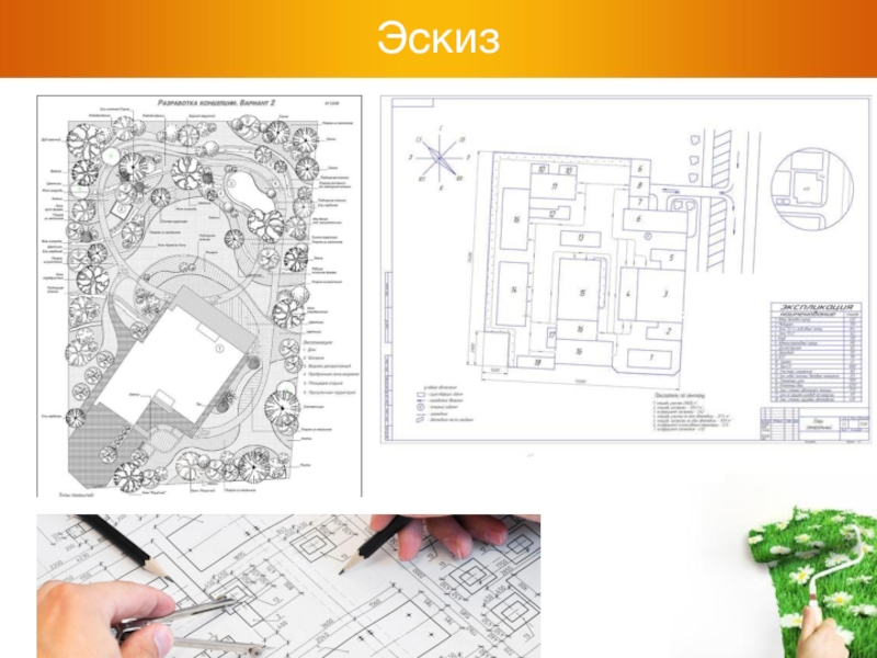 местности на зоны. Это территории для активного и пассивного отдыха, парадный вход, огородные и садовые зоны, хозяйственные постройки и др. Эскиз – это один из вариантов генерального плана. Обычно специалисты делают несколько эскизов, которые утверждают вместе с заказчиком. Привязка планируемых объектов и насаждений осуществляется к уже имеющимся на участке строениям, деревьям и прочим объектам. После создаётся генеральный план.