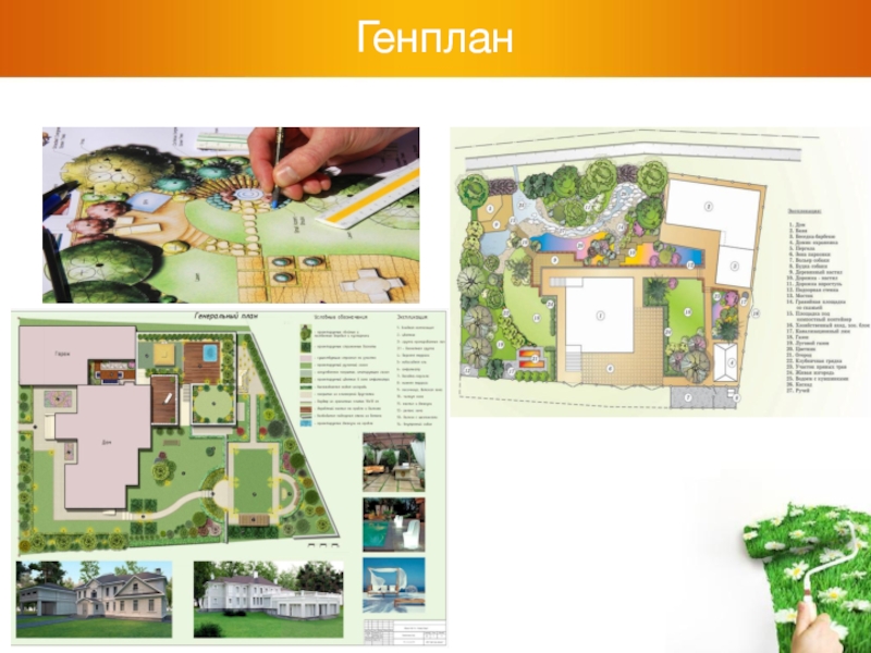 СЛАЙД 7: Генеральный план представляет собой набор эскизов различного назначения, которые в мельчайших подробностях описывают задумку дизайнера. Выполняется он обязательно в цветном виде на компьютере или вручную.