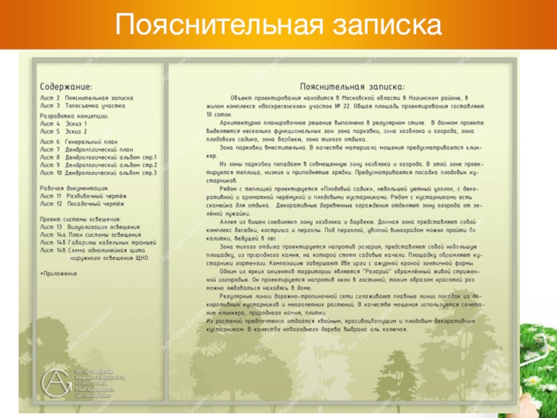 СЛАЙД 12: Пояснительная записка завершает генеральный план, отражает само задание для проектирования, анализ состояния участка и также композиционное решение. После приёма генерального пакета осуществляется сам проект. На этом этапе уже не важно, какая компания будет работать с чертежами, хотя и существует понятие авторского сопровождения, когда дизайнер контролирует точность исполнения макета. Также используется авторский надзор, когда специалисты в течение года после исполнения продолжают отслеживать проект.
