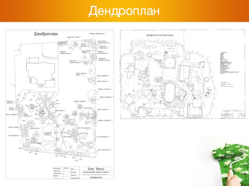 СЛАЙД 10: Дендроплан используется для расстановки деревьев, в нём отражается расположение зданий, границы проекта, цветники из посадочного чертежа и размеры крон деревьев в момент расцвета. Иногда посадочный чертеж и дендроплан объединяются.