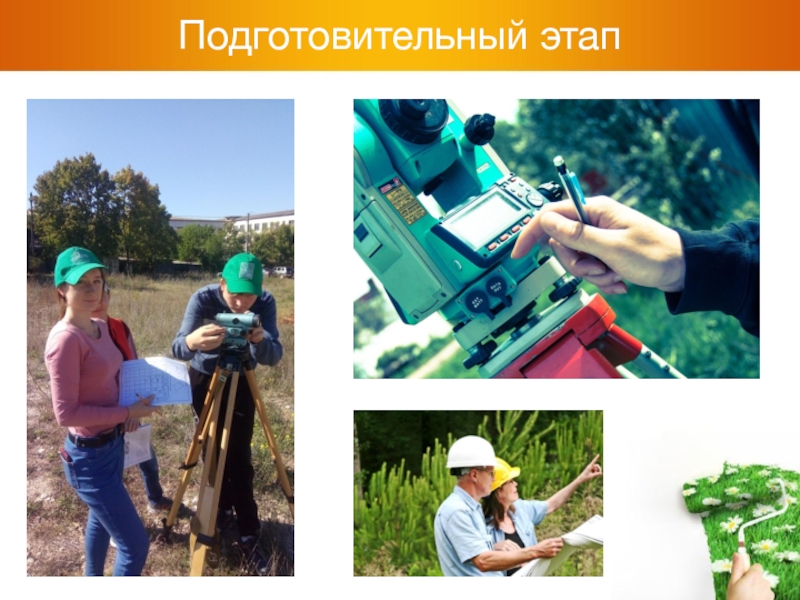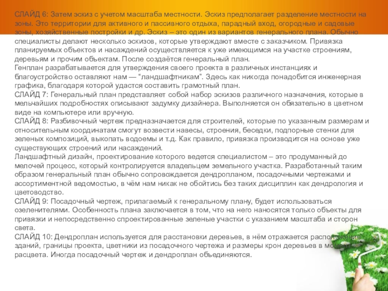 СЛАЙД 4: Проектированию предшествует подготовительный этап. Собираются все данные об используемом участке: рельеф территории, анализируется грунт, уточняется наличие или отсутствие на участке источников воды. Результаты этих исследований ложатся в основу будущего плана, по которому будет выполняться озеленение участка. Помимо вышеуказанных факторов, во внимание принимается степень освещенности участка, его открытость ветрам, климатические особенности и прочие нюансы, которые могут повлиять на выбор тех или иных декоративных растений. На этом этапе нам пригодятся знания геодезии и почвоведения.